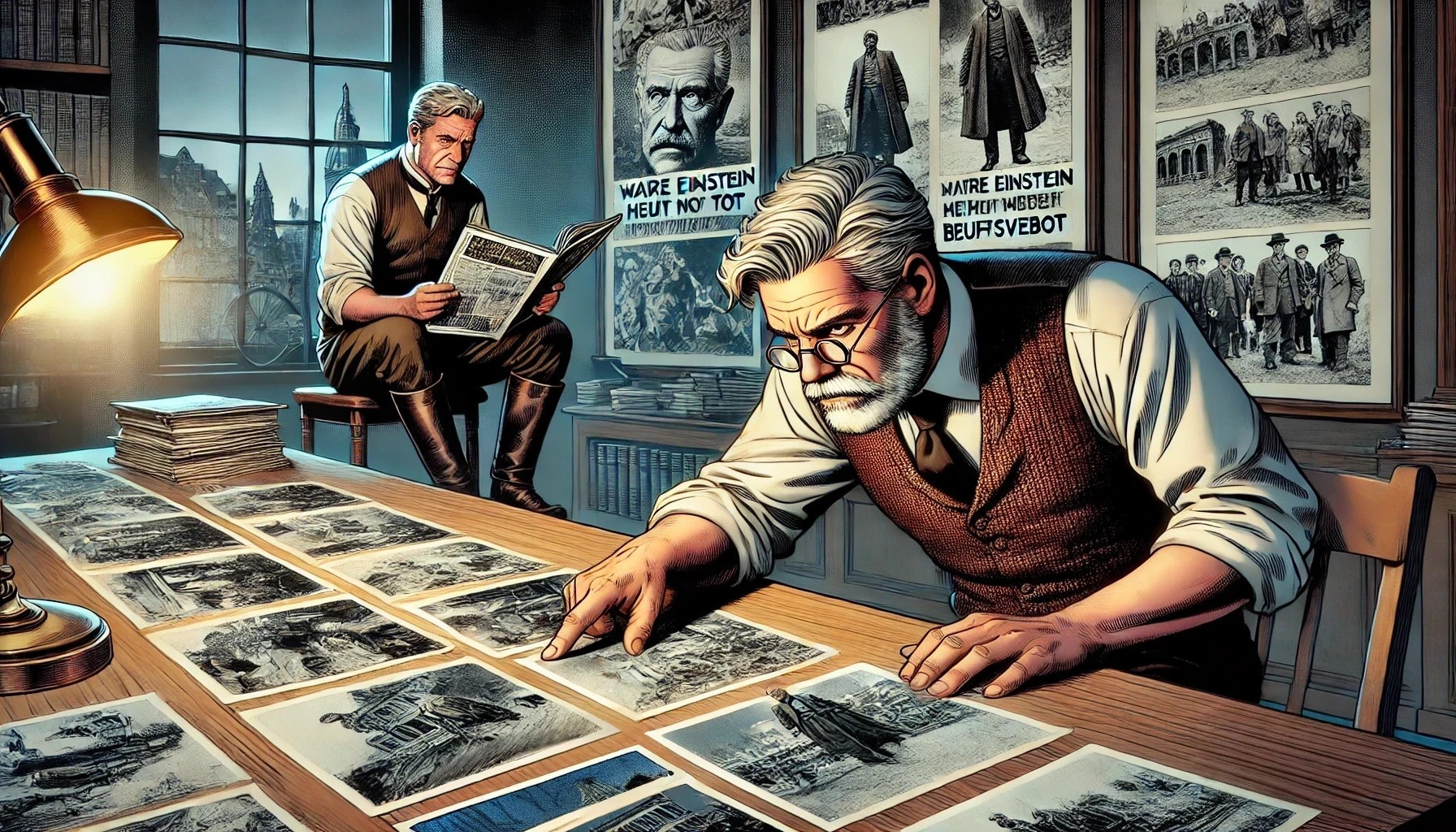 Auf dem Tisch lagen einige Photos , die das im Krieg zerstörte Ulm zeigten.