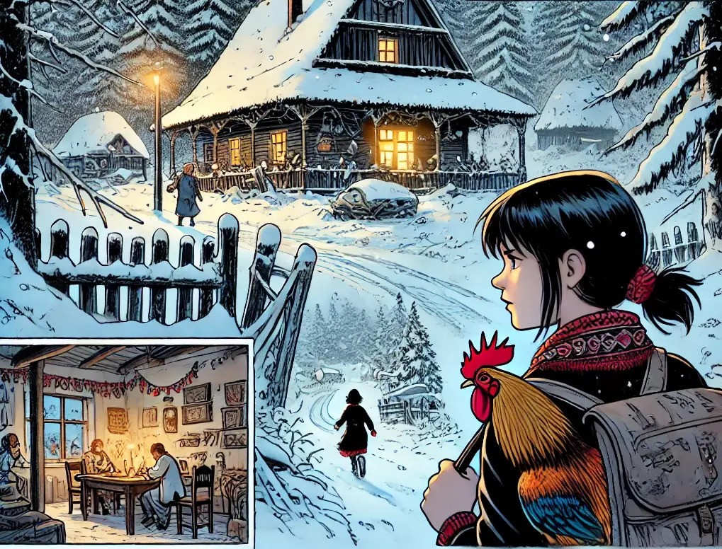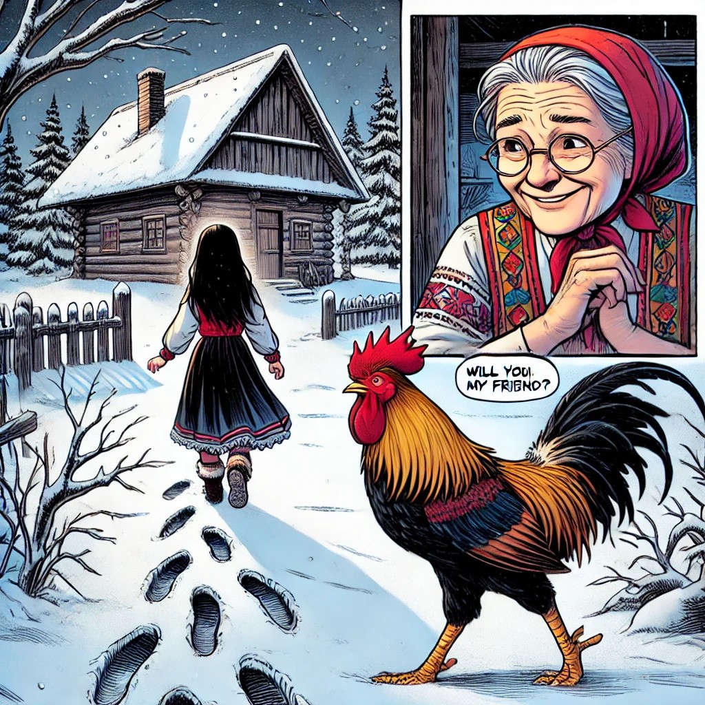 Es ist Winter. Sie geht auf eine Hütte zu. Bevor sie dort eintritt, kommt ein schöner Hahn auf sie zu, er weicht nicht von ihrer Seite. „Willst du mein Freund sein?“ fragt Mirela. Der Hahn nickt mit dem Kopf.
